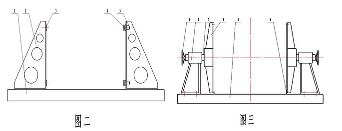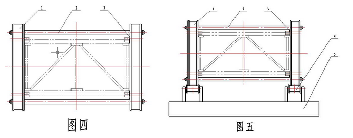 框架固定式工裝如圖四所示:由兩塊鋼結(jié)構(gòu)件的端板(件1)及四根聯(lián)接桿(件2)組成。兩端板應保證聯(lián)接孔的位置度、四根聯(lián)接桿要長度一致,這樣才能保證焊接工裝有較高的精度。使用時,先將焊好聯(lián)接套的主弦桿用安裝到端板上,其中一側(cè)用楔鐵(件3)頂緊,另一側(cè)則緊貼端板,再將其它構(gòu)件與主弦桿點焊,點焊后將結(jié)構(gòu)件卸下,并完成全部焊縫的焊接。這種工裝的優(yōu)點是:結(jié)構(gòu)簡單,制造成本較低,加工效率高,精度較高。缺點是:不能在工裝上完成全部焊縫,由于主弦桿一側(cè)是由楔鐵頂緊的,所以標準節(jié)在這一側(cè)的精度會受到一定影響。